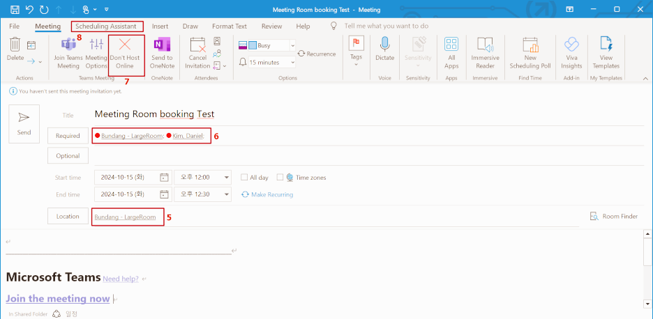 8. 참석자들의 스케줄이 가용한 지 점검하기 위해서는 일정 보조(Scheduling Assistant)를 Click 한다.