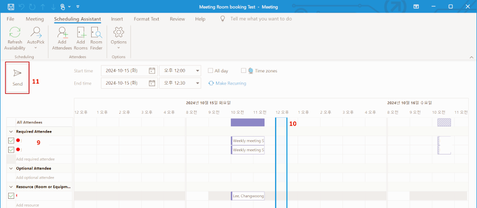 11. 가용상태를 확인하였으면 Send button을 눌러 회의에 초대하자