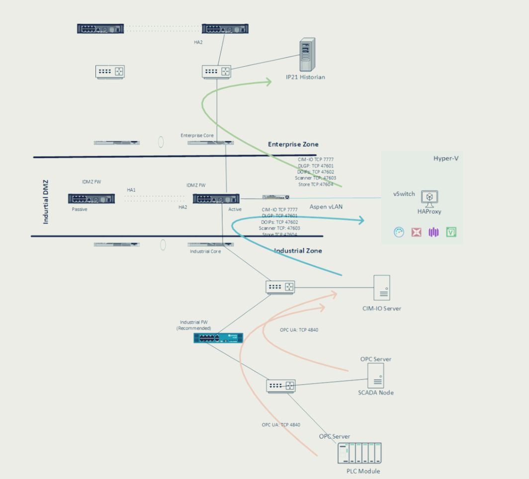 - IDMZ 방화벽(FW): 활성-수동(HA) 모드로 작동하며, 산업 존과 엔터프라이즈 존 간의 통신을 안전하게 보호하고 HA를 보장한다.