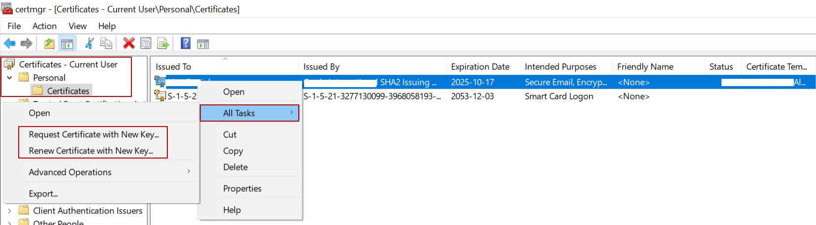 - Windows: certmgr.msc를 실행하여 개인(Personal) > 인증서(Certificate) 항목에 저장한다.