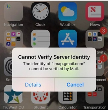 This issue typically occurs in the Mail app, where it states that "imap.gmail.com" cannot be verified due to an untrusted authority. The error prompt on iOS offers two options: Details and Cancel.