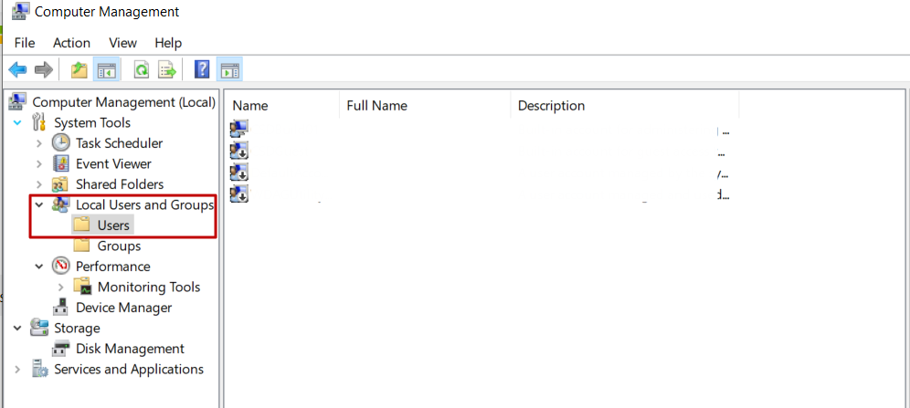 - 윈도우 버튼 -> 마우스 우측 버튼 클릭 -> 컴퓨터 관리(Computer management) → 로컬 사용자 및 그룹(Local Users and Groups) → 사용자(Users)로 이동한다.