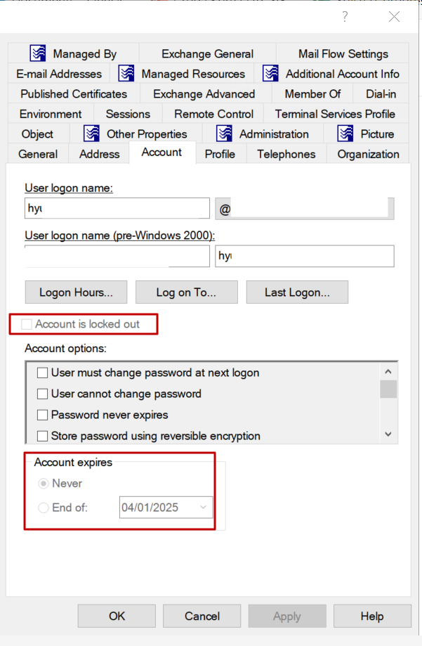 Active Directory 사용자 및 컴퓨터(ADUC)에서 다음 계정 속성을 다시 확인한다.
