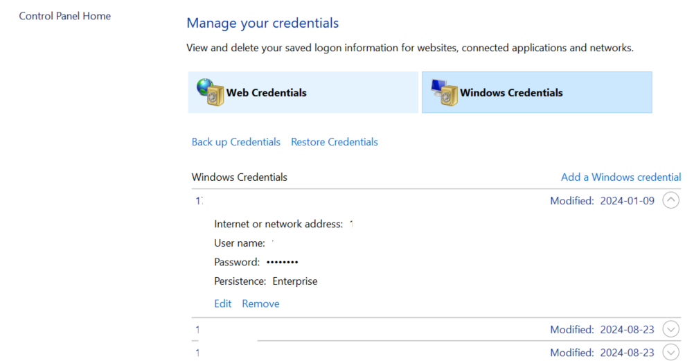 - 제어판 → 자격 증명 관리자(Credential Manager)를 열고 사용자와 관련된 저장된 자격 증명을 삭제한다.