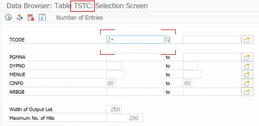 - 트랜잭션 코드 필드에 Z* 또는 Y* 입력 후 F4 (검색)