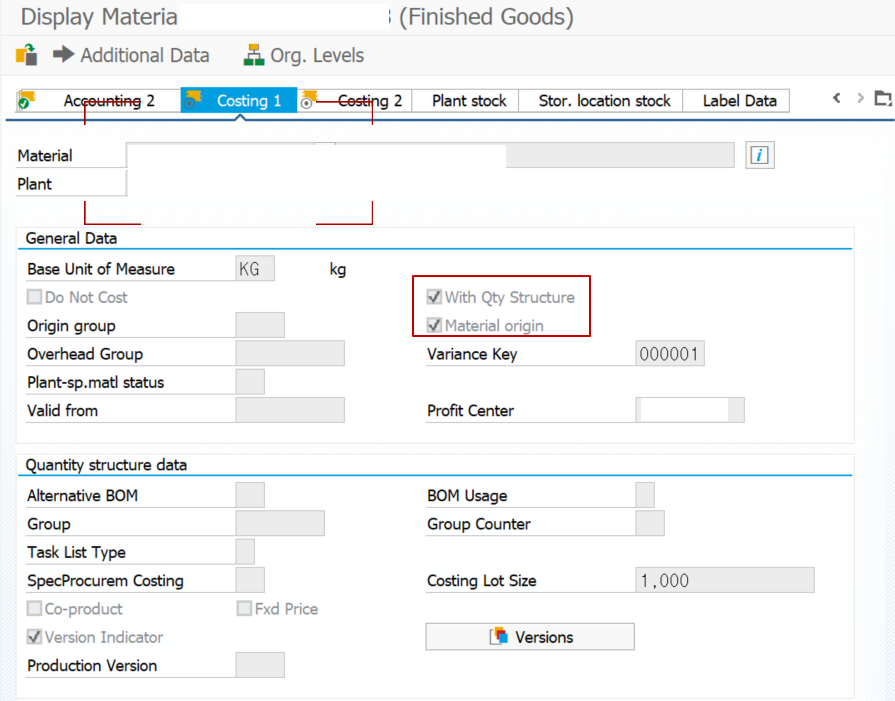 - 기본적으로 완제품의 손익 센터는 자재 마스터(MM) 의 Costing1 탭의 With Qty. Structure, Material Origin field가 check되어 있어야 한다.