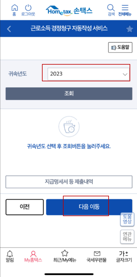 - 우측 상단 메뉴 → [세금신고] → [종합소득세 신고] → [종합소득세근로소득신고(경정청구)]