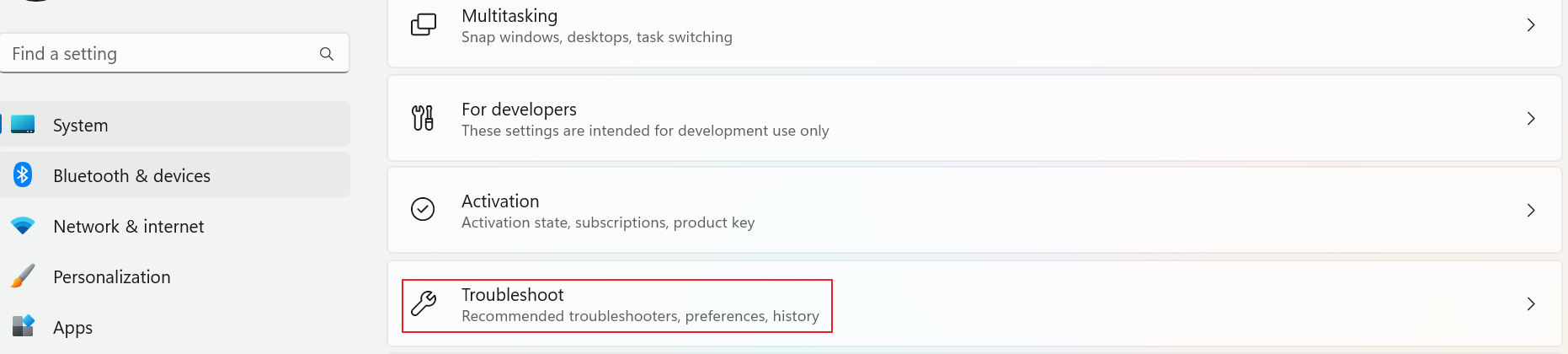 - 설정(Settings) → 시스템(System) → 문제 해결(Troubleshoot)