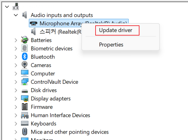 - 사용 중인 오디오 장치를 우클릭 → 드라이버 업데이트(Update Driver)