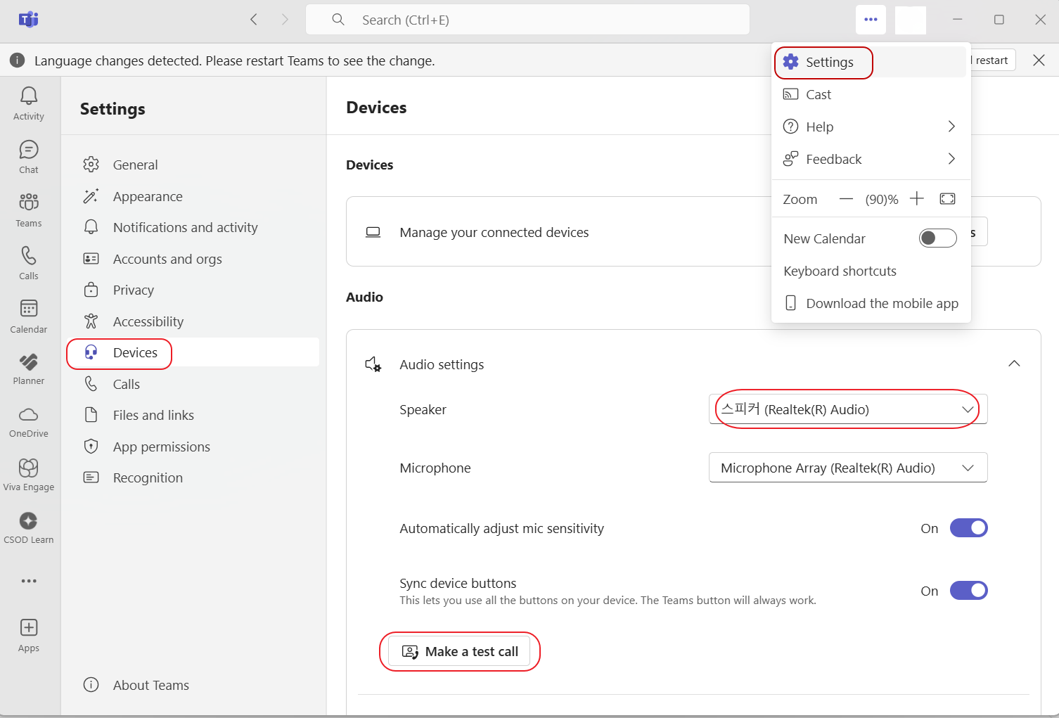 - 다시 Microsoft Teams 실행 후 소리 정상 여부 확인