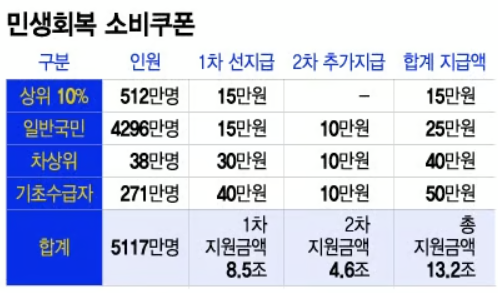 최종 지급액은 상위 10% 15만원, 일반국민 25만원, 차상위계층 40만원, 기초수급자 50만원이고 상위 10%는 건강보험료 등을 통해 대상을 결정한다고 한다.