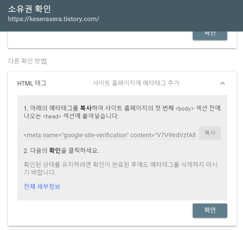 → 사이트 소유권 확인 방식 중 HTML 메타 태그 복사 선택