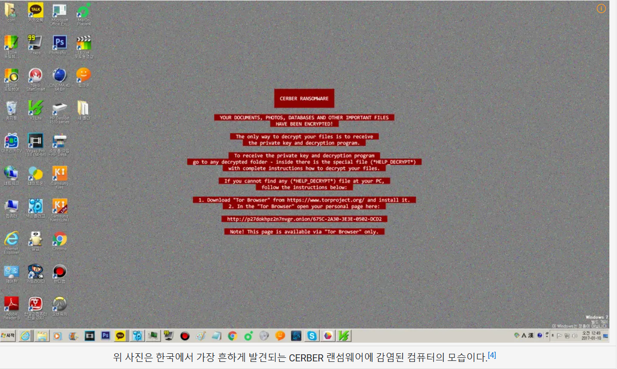 이 악성코드는 대개 이메일 첨부파일, 웹사이트 광고 배너, USB 장치 등을 통해 유입된다. 일단 감염되면 사진, 영상, 업무문서 등 중요한 파일이 전부 잠기며 사용할 수 없게 됨.