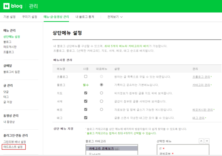 - 메뉴.글.동영상 관리: 좌측 메뉴에서 '메뉴.글.동영상 관리'를 선택