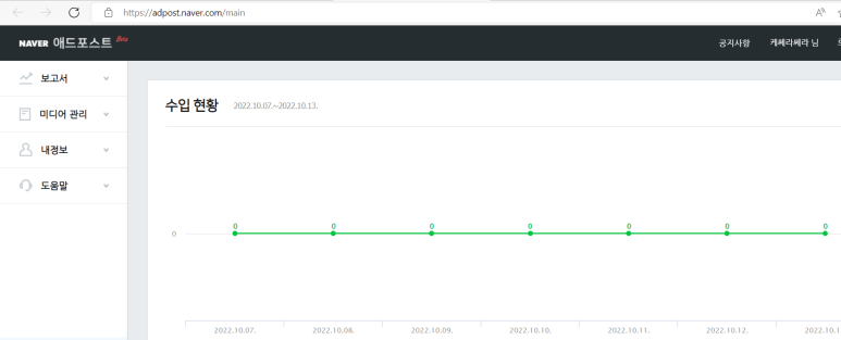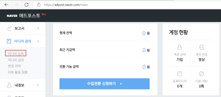 애드포스트 미디어 등록 작업 완료 후, 내 블로그에 들어와 블로그 관리 쪽의 메뉴.글.동영상 관리 메뉴에서 플러그인 연동 관리 메뉴 하단의 애드포스트 설정을 누르면 애드포스트 수입 현황 화면이 나온다.