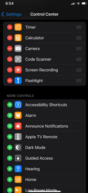 제어판(Settings)->제어센터(Control Center)-> 포함된 제어 리스트(Included Controls) 항목